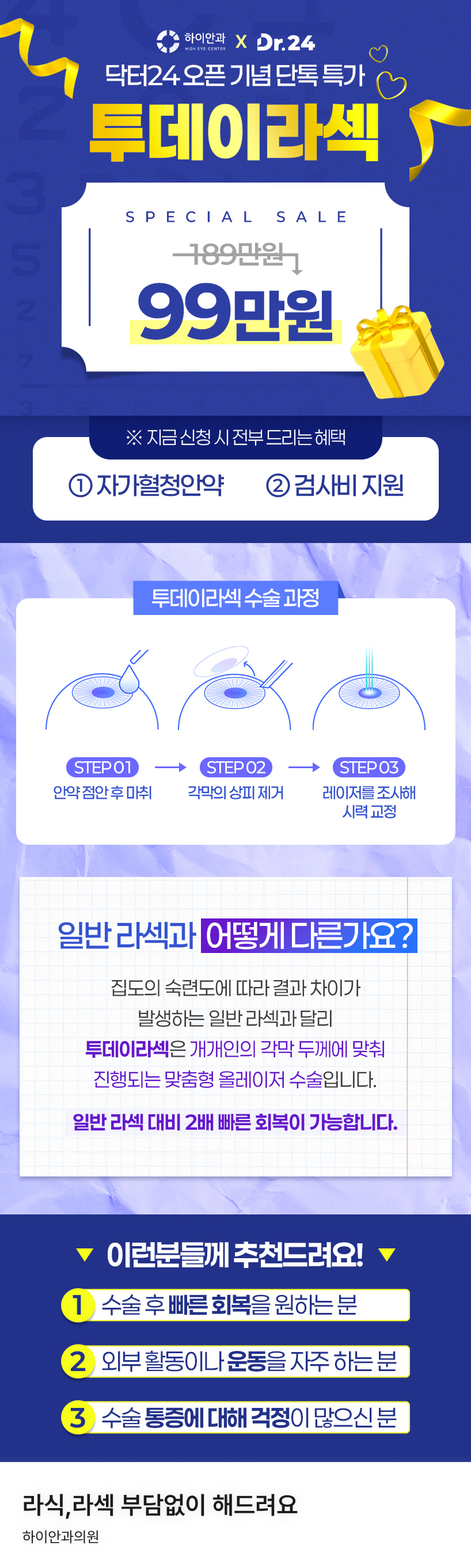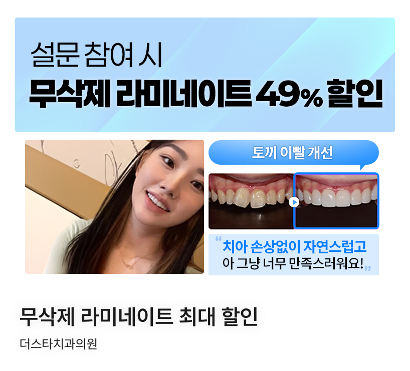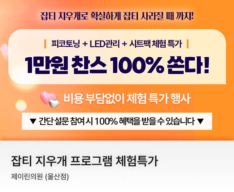 ※ 명시된 시술/수술 외 다른 시술/수술 또는 개인의 차이에 따라 가격이 달라질 수 있습니다. ※ 수술 후 출혈, 감염, 신경 손상 등의 부작용이 발생할 수 있습니다. ※ 개인마다 시술 시간 및 가능 여부는 상이할 수 있으며 상태에 따라 달라질 수 있습니다.